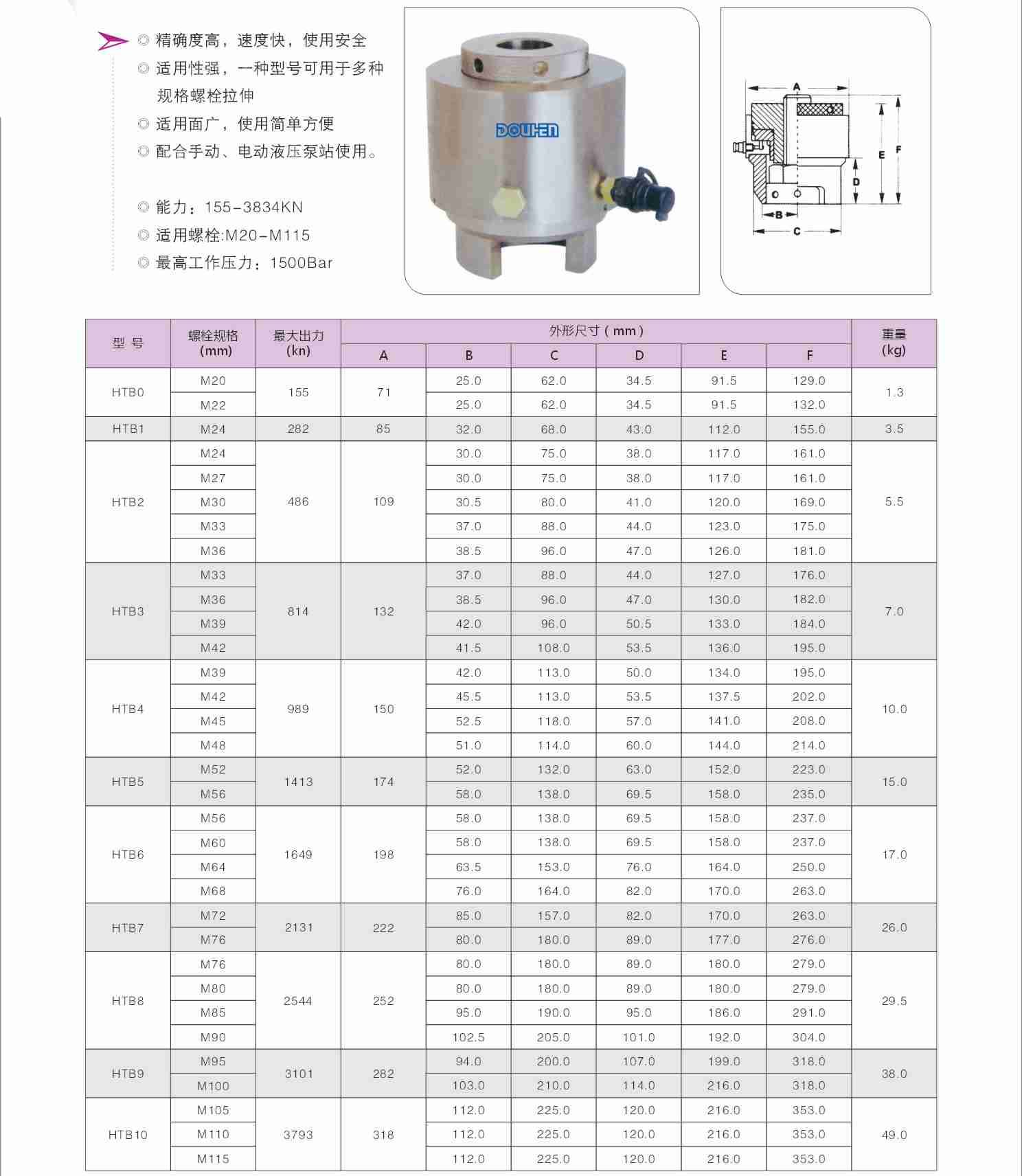 7、拉伸能力:155-3834Kn;適用螺栓:M20-M115;工作壓力高達:1500Bar